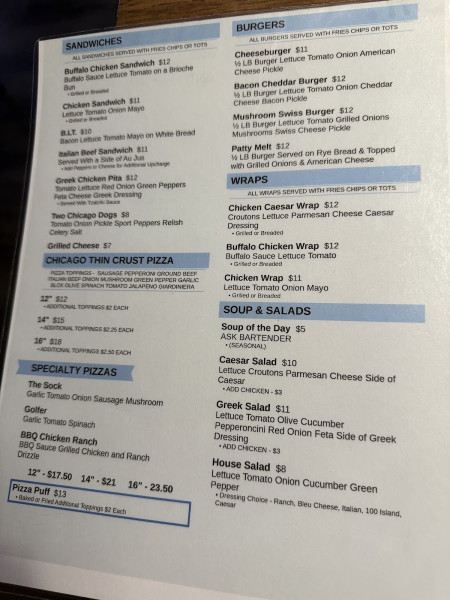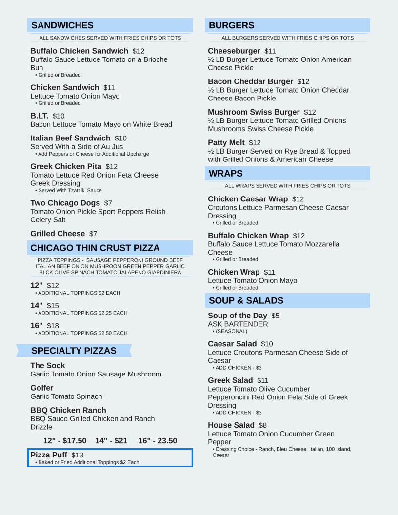 Welcome to The Sock Bar & Grill, a hidden gem located in Hickory Hills, IL, where comfort food meets a lively social atmosphere. The menu features an array of offerings that cater to every palate. Start your meal with a refreshing Greek Chicken Salad or the hearty Buffalo Chicken Salad, each brimming with fresh ingredients and bold flavors. Pizza lovers will delight in their unique BBQ Chicken Pizza or the spicy Taco Pizza, both made with quality toppings that promise satisfaction in every bite.